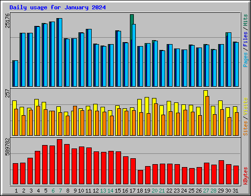 | Day | Hits | Files | Pages | Visits | Sites | KBytes | ||||||